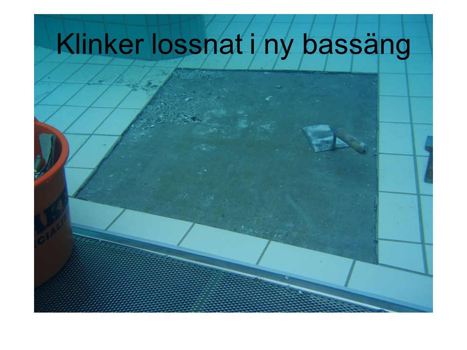Typiskt kantstött klinker Långbrohallen. Älvsjö Före Efter Omvårdnad Bassänghall 50+ år gammal bassäng. Efter omvårdnad är bassängen som ny. Vällingby Sim & Sporthall Underhåll och byte av sektion på rutschbana. Husbybadet. Besiktning. Erikdalsbadet Stockholm. Axplock av projektbilder under årens lopp